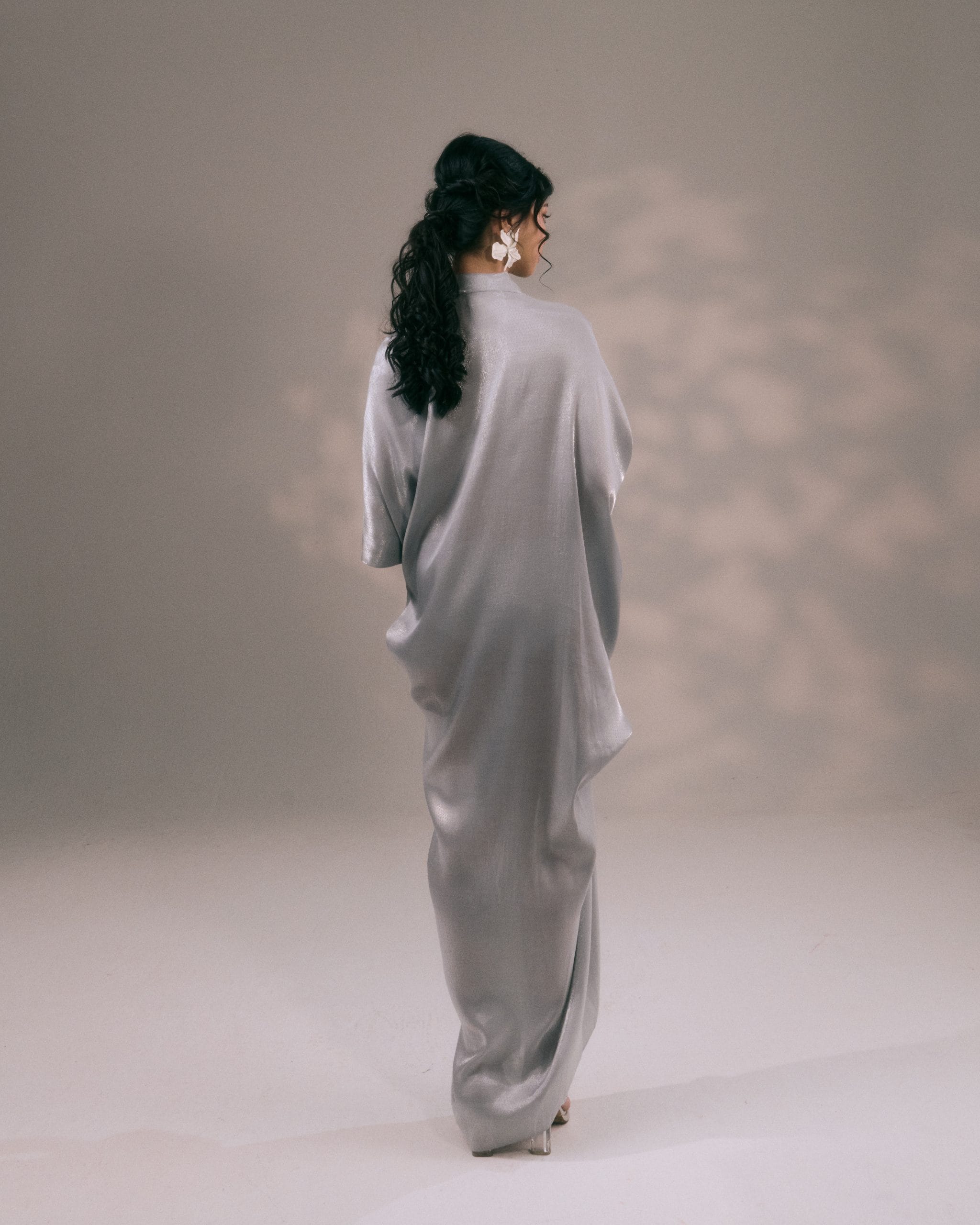 For this Raya collection, the Xhenía dress is offered in two sizes — S/M and L/XL, designed to provide a relaxed, elegant fit while preserving the graceful drape that defines the piece.