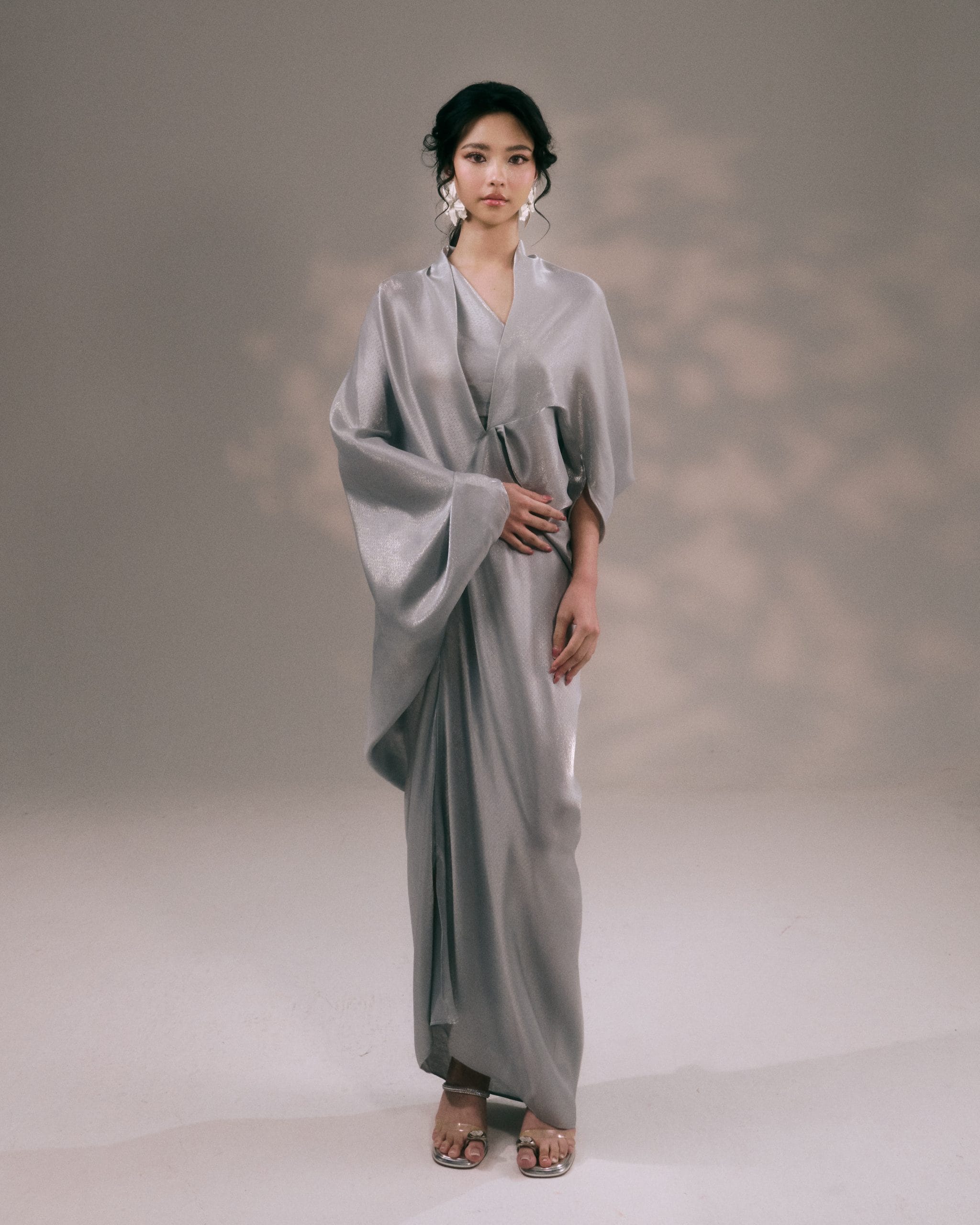 This fluid kaftan dress is crafted from a lustrous dobby-textured fabric, offering a soft sheen and graceful movement that enhances its sculptural drape. The design features an elegant V-neckline with a kimono-inspired collar, creating a refined yet effortless silhouette.
