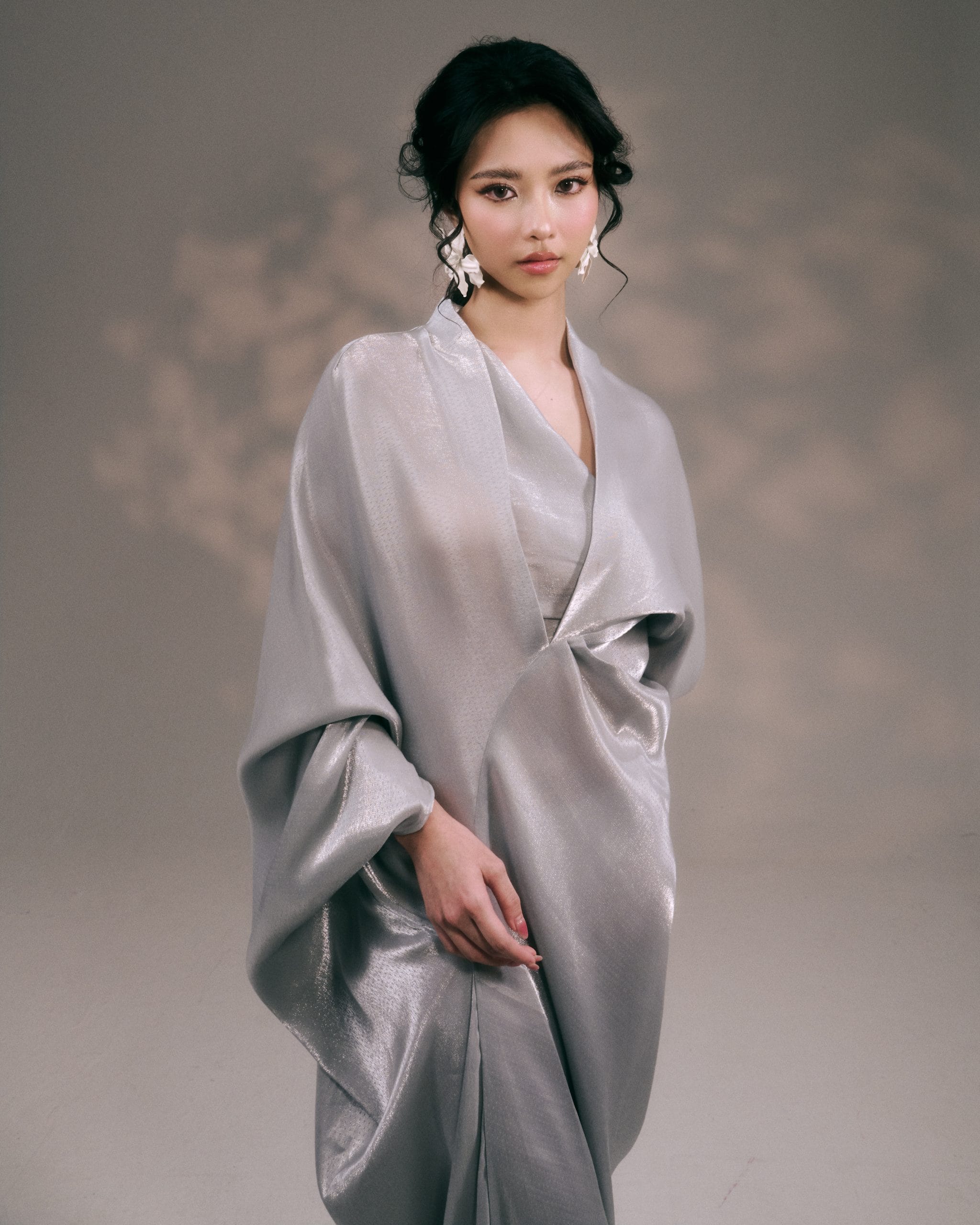 Tailored as a single flowing piece, the dress is distinguished by a center seam that forms gentle folds across the body, allowing the fabric to fall beautifully with every movement. Asymmetrical sleeves further elevate the design, adding a modern architectural touch while maintaining the signature fluidity of the Xhenía silhouette.